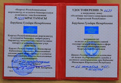 Кроме того, представителю Центра переподготовки и повышения квалификации Академии в Баткенском государственном университете, Бөрүбаевой Гульбаре Назырбековне, был вручен нагрудный знак «Отличник местного самоуправления Кыргызской Республики».